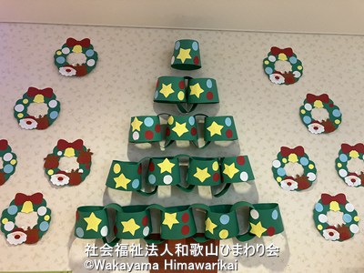 壁面の立体ツリーは、緑の画用紙を輪っかにして並べた手作りの作品です⭐