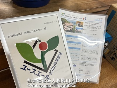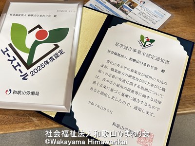 先週金曜日に和歌山労働局のご担当者様より、認定のお電話をいただき、本日認定証書と認定プレートを配送にて受領いたしました。