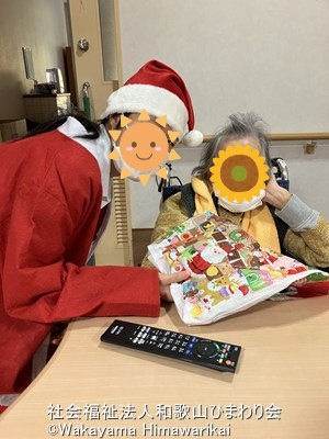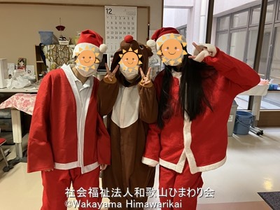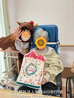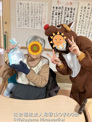 職員がサンタクロース&トナカイの着ぐるみに扮装し、利用者様の前に登場すると「あれ~可愛いよ~」「よー似合ってるなー」など笑い声や拍手が聞こえてきました!笑