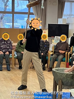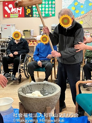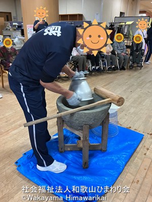 この日参加された、ヘリオス・デイサービスの利用者様も、杵と臼が用意されると、「おぉ~大きいな~」「楽しみやな!」など皆さんワクワク😀