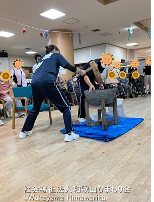 餅つきが始まると、皆さん大喝采!!!利用者様や職員も交代しながら力一杯、杵を振り上げ餅つきを行っていました!