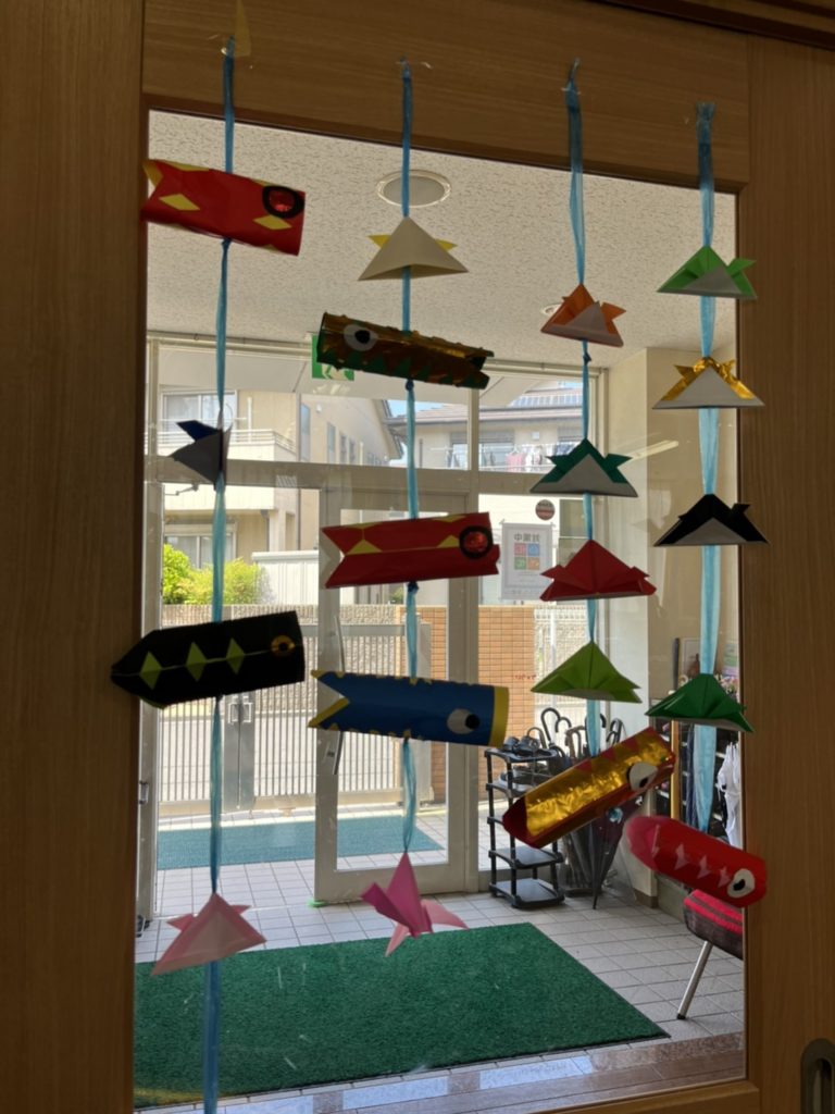 せいがの森の出入り口には、利用者様と折り紙で作った鯉のぼりと兜を飾っています。
