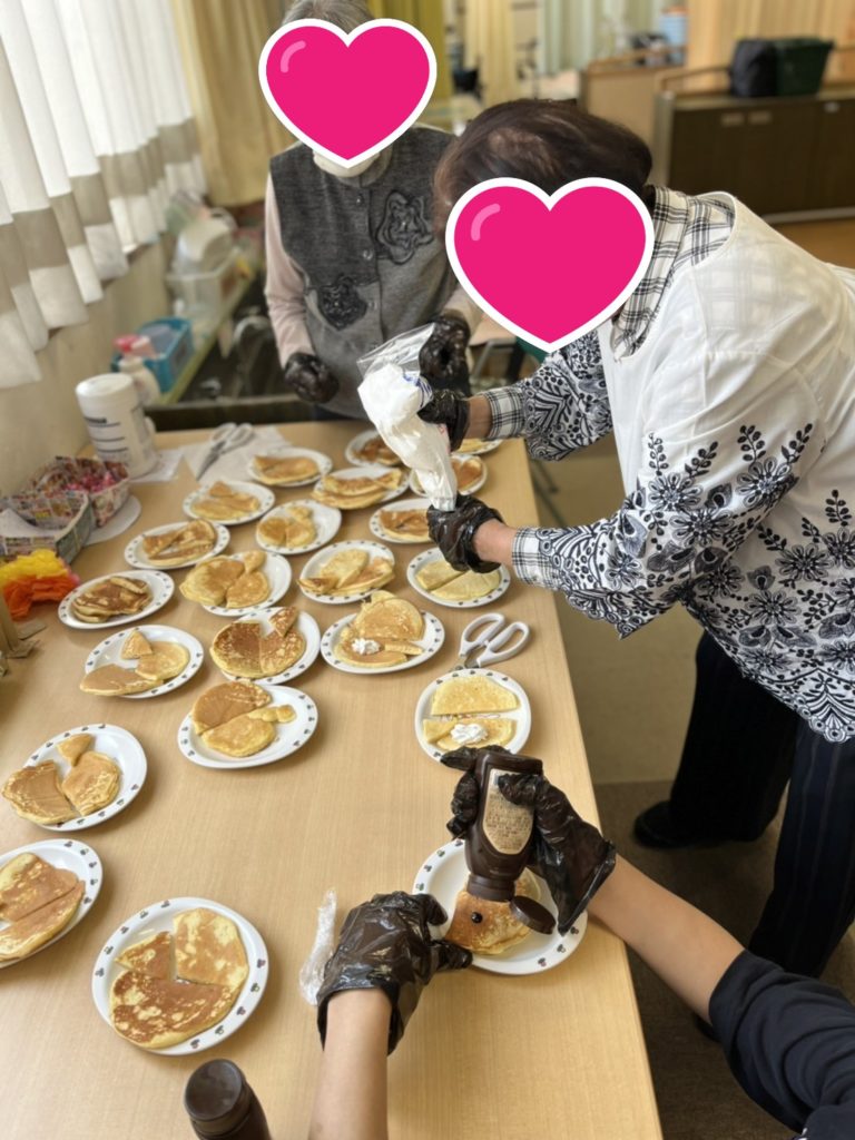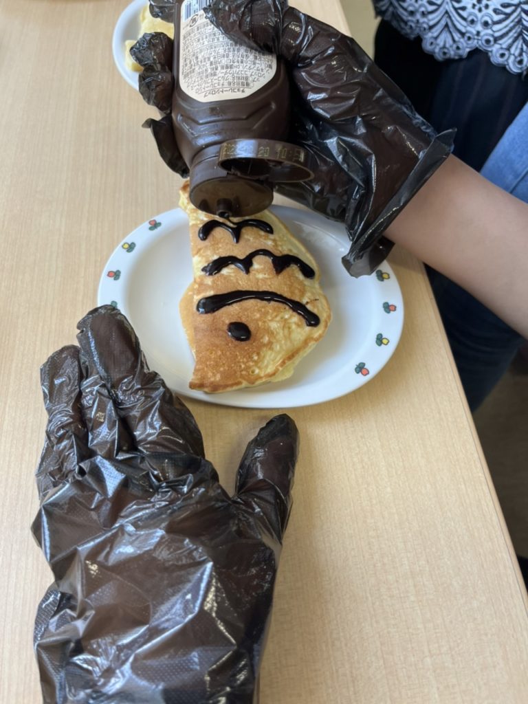 利用者様と一緒にホットプレートで焼き上げ、デコレーションは利用者様にお任せしました!