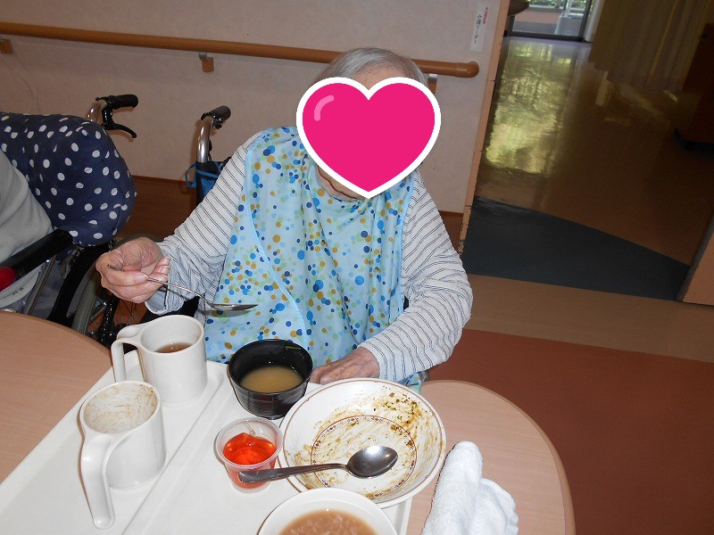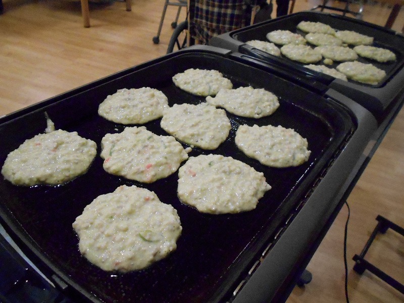 お好み焼きは人気メニューなので、いつもより多めに作っています。嚥下機能が低下している方には、焼き上げた香ばしくなったお好み焼きをミキサーにしてお召し上がりいただいたり、おにぎりをお粥にしたり、利用者様の状況に応じたものをご提供しています。