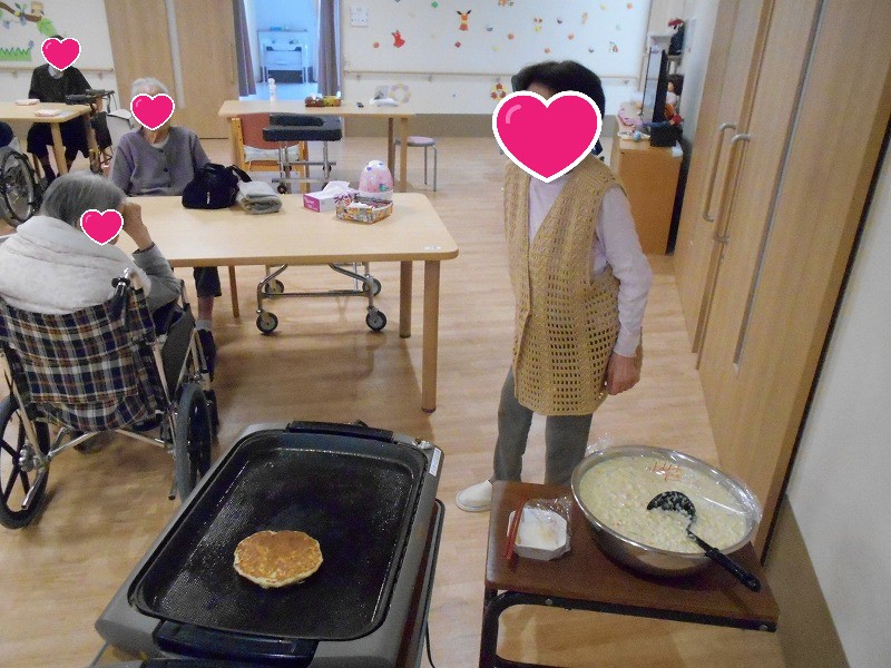利用者様の目の前で、臨場感たっぷりに焼き上げるお好み焼きは、香ばしいソースの匂いが食堂いっぱいに広がります。同時に、職員のお腹が「ぎゅーーーー」っと鳴る、職員にとっては残酷なメニューとなります(笑)