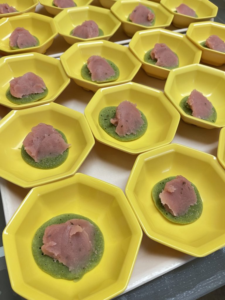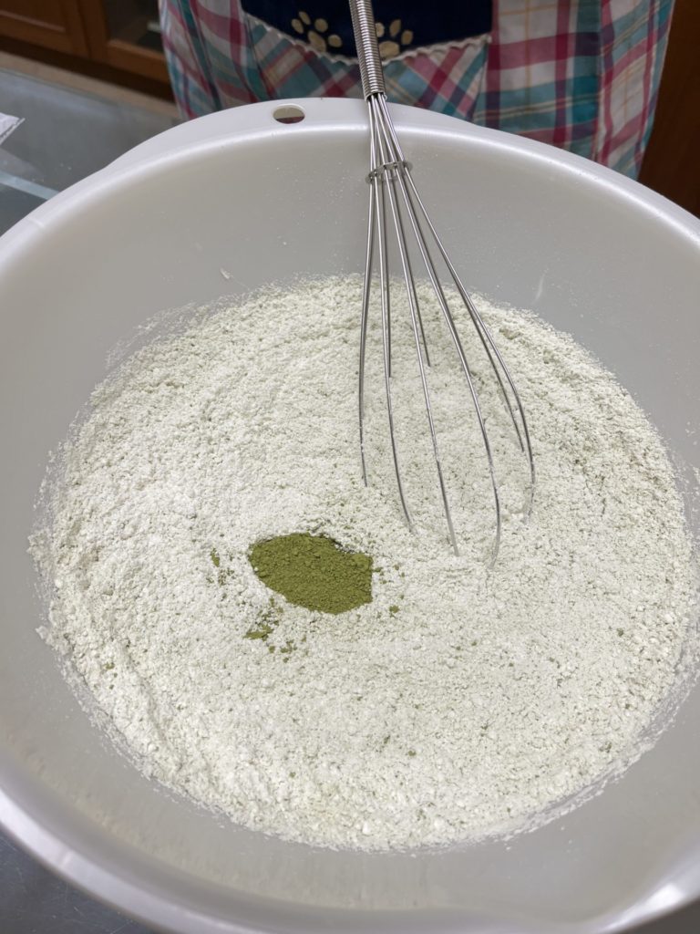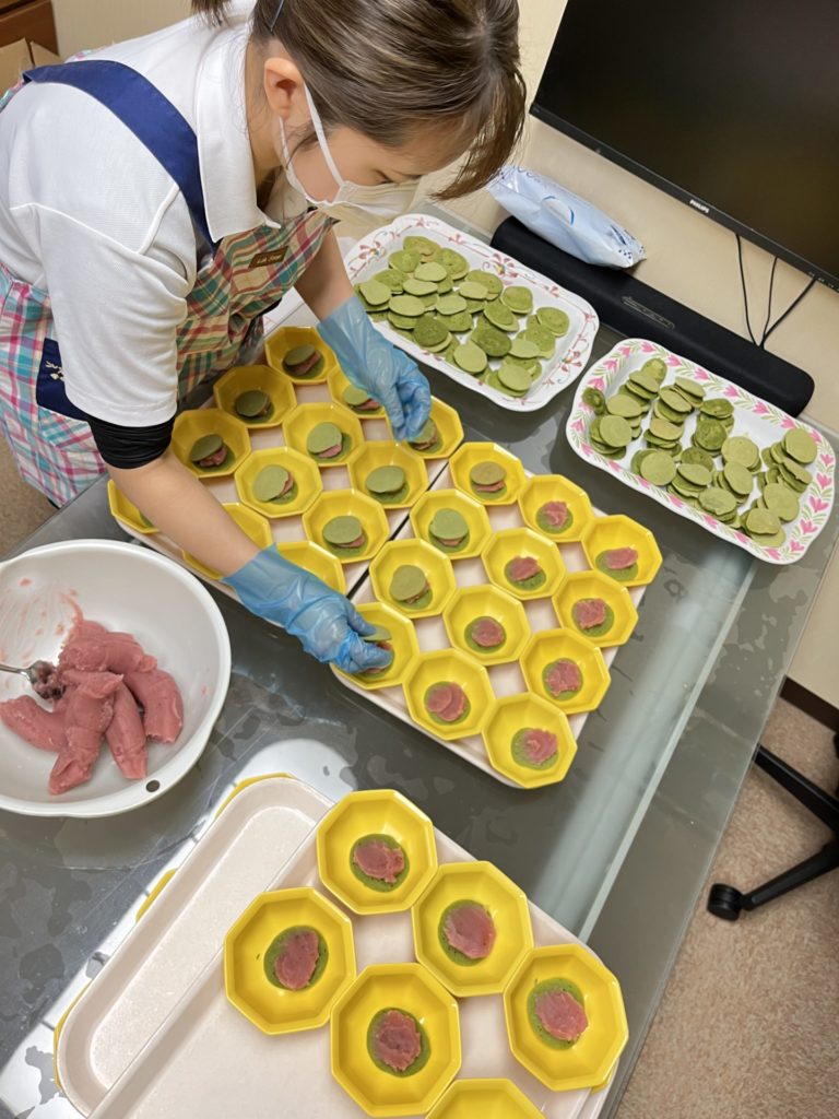 抹茶の爽やかな緑色と、鮮やかな桜餡が映えるオヤツが出来上がりました。