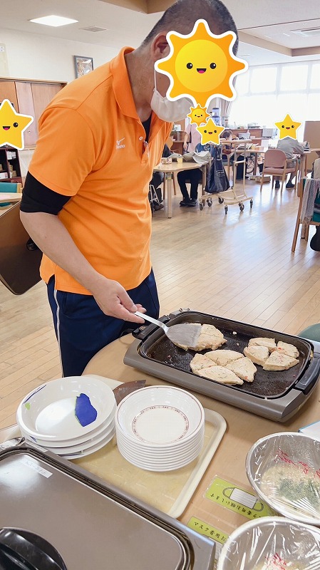 デイサービスセンター広川苑では、5月行事食として利用者様の目の前で焼くお好み焼きを作りました!