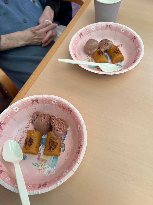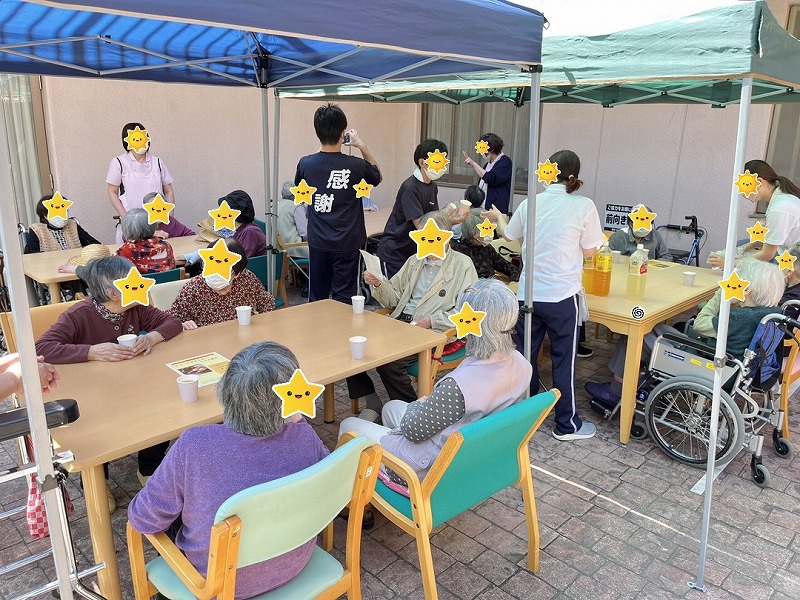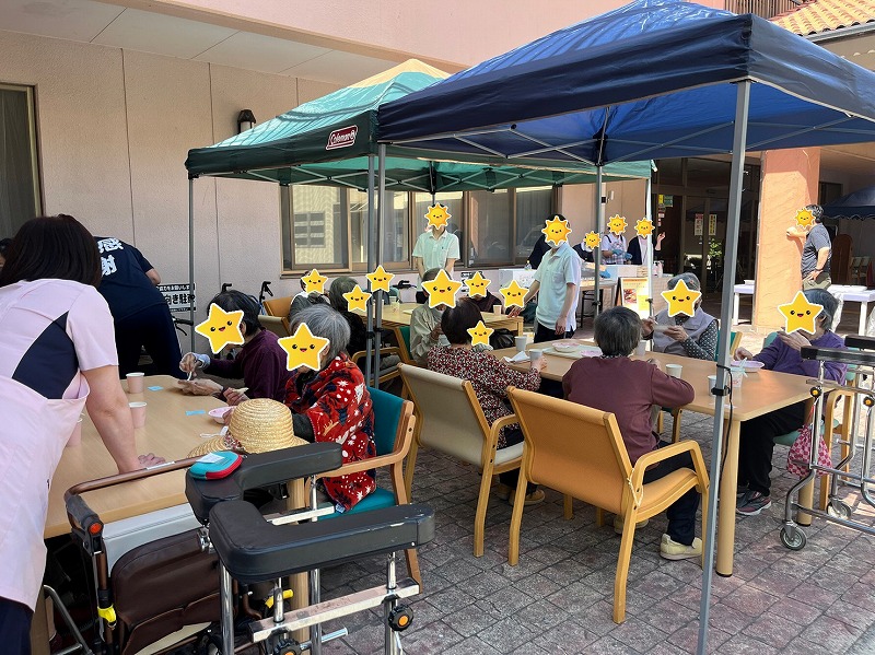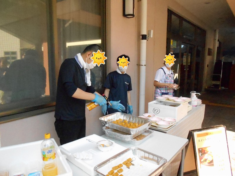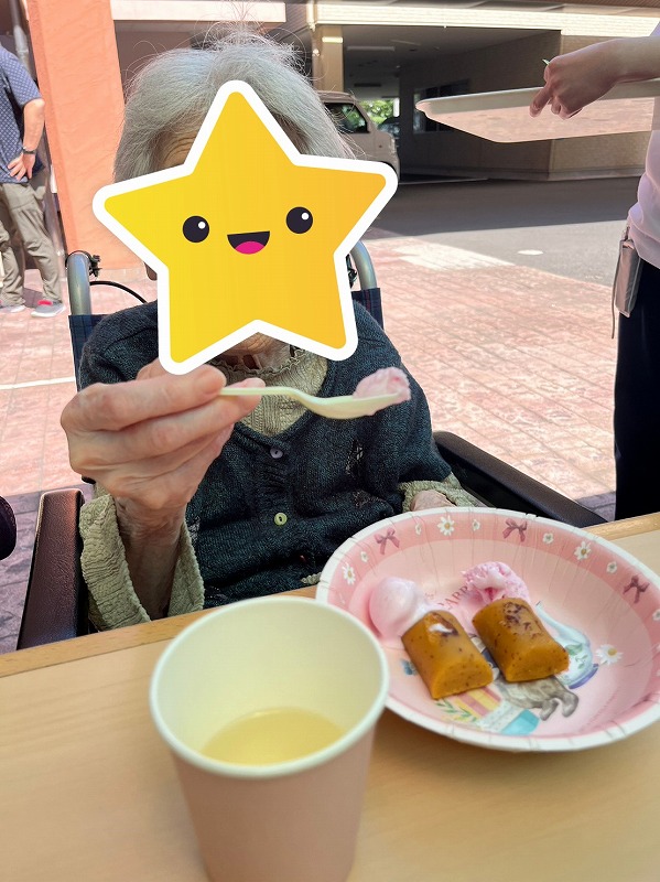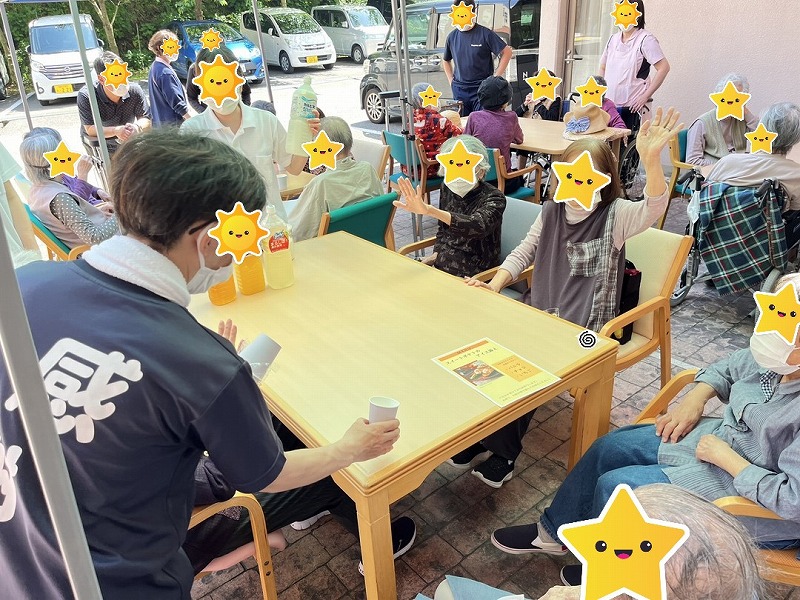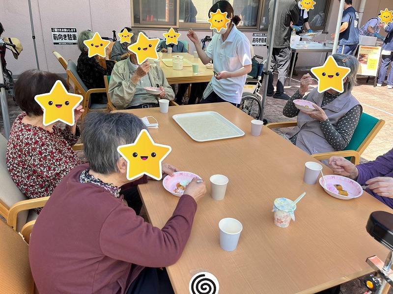 いつもとは気分を変え、外に出て青空の下でまるでカフェテラスのようにおやつをご提供させて頂く取組みです。
