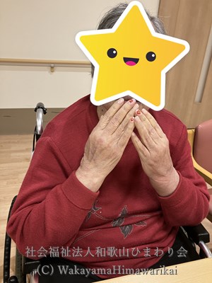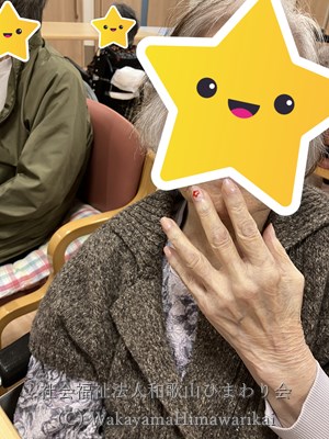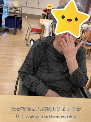 入所者様に好きな色や図柄をお尋ねしながら、まずは手のマッサージから。