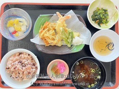 厨房の職員さんが、頑張って天ぷらをたくさん揚げてくれました。またお祝いの赤飯も美味しかったです♪(職員給食も同じメニューでした)