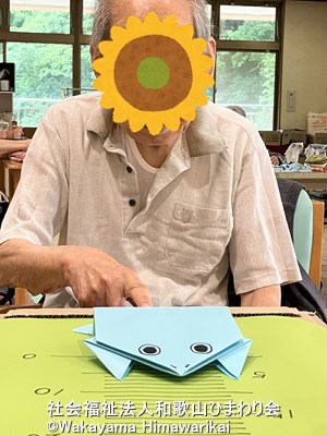 梅雨のジメジメを吹き飛ばすべく、本館3階では楽しいレクリエーション「かえるぴょこぴょこジャンピング競争」を開催しました!