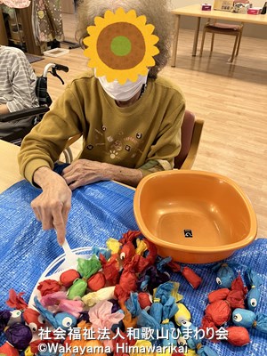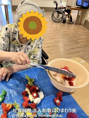 うちわを使ってそっとすくう入所者様、金魚が逃げてしまい「あ〜っ!」と声をあげる入所者様、