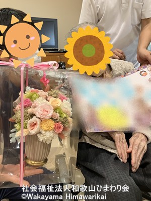 職員一同でお祝いをさせていただき、苑からはホールケーキ🎂とブリザーブドフラワー💐をプレゼント!また、職員の寄せ書きを記した、色紙もお渡ししました。