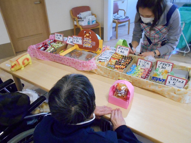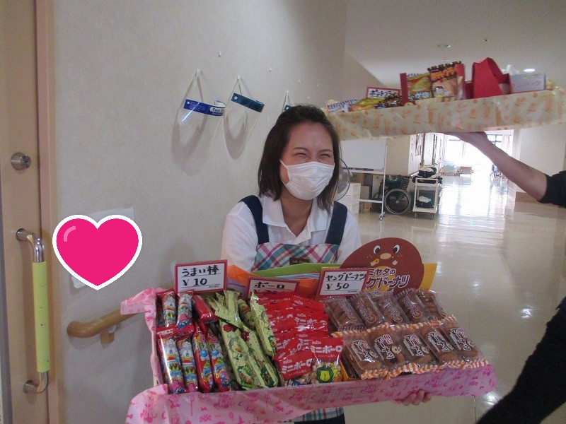 本日、特養に駄菓子屋さんが来てくれました。(本当は栄養士です)