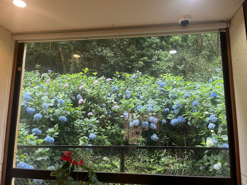 玄関入ってすぐの窓からも、満開のあじさいが観れますよ。