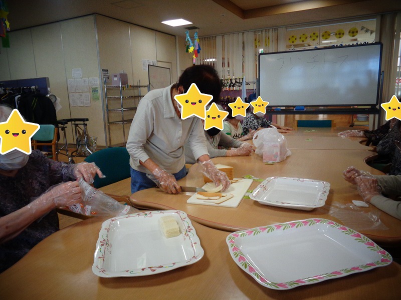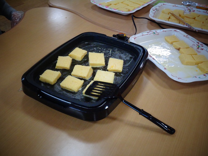 利用者様に手伝って頂いて、フレンチトーストを作りました。