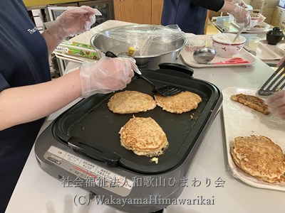 アツアツの鉄板に生地を流し込んだ時の「じゅっー!」という音と匂いが、入所者様と共に職員の食欲もそそります😋(職員の食事は、入所者様が召し上がった後です😅